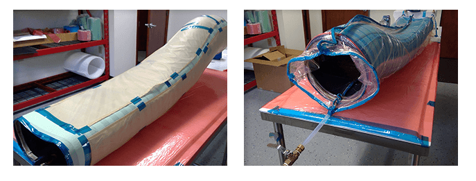 The braided sleevings were secured to the Smart Tool to prevent slippage and then a release ply was wrapped around the dry carbon fiber sleevings. A strip of flow media was attached to the release ply and then a vacuum bag was placed both inside and outside of the prepped Smart Tool. Next tubing was inletted and exited through the vacuum bag and into the dry carbon fiber and the vacuum bags and tubing were sealed with vacuum tape.